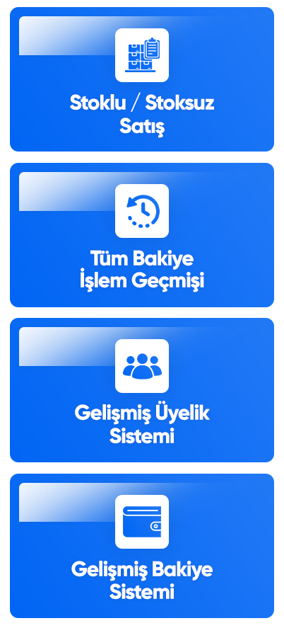 Gelişmiş Bakiye Sistemi: bayileriniz bakiyeleri ile harcama yaparlar, bakiye yüklemelerde ödeme komisyonuda alabilirsiniz panelden bu komisyon oranını tüm ödeme yöntemlerinde belirtebilirsiniz, bakiye bonus sistemi gibi çeşitli özellikler.