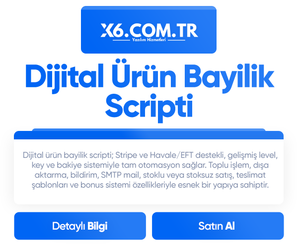 Stripe ve Havale/EFT destekli, manuel/otomatik teslim, key ve bakiye sistemiyle tam otomasyon sağlayan dijital ürün bayilik scripti. Toplu işlem, teslimat şablonları, stok yönetimi, SMTP mail ve bonus sistemi gibi gelişmiş özelliklerle esnek kullanım sunar.