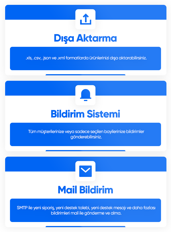SMTP (E-Mail Bildirim): müşteri yeni sipariş, admin yeni sipariş, sipariş teslim, yeni destek talepi ve talep yanıt bildirimi gönderebilirsiniz ayrıca istemediklerinizi aktif / pasif ilede yönetebilirsiniz.