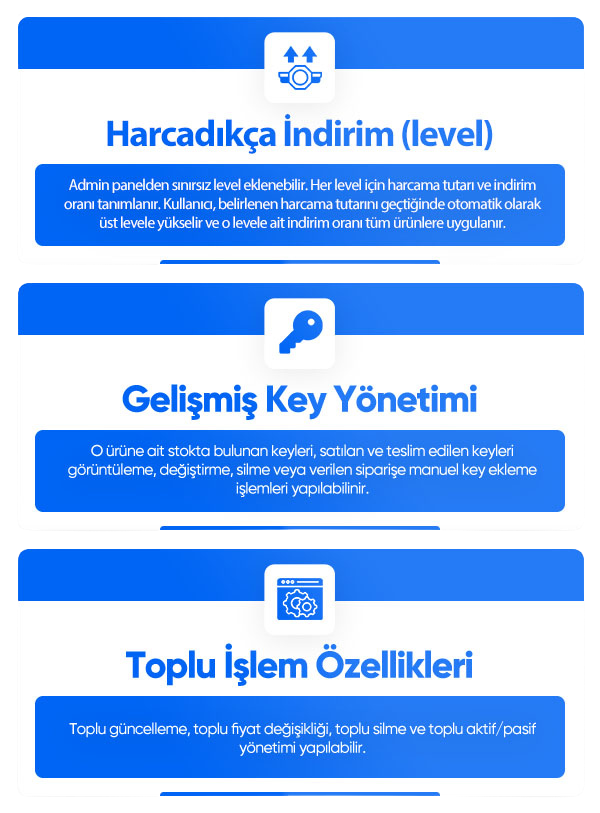 Gelişmiş Key Yönetim: ürünlerinizde stoklara eklediğiniz keyler hangi müşterinize satılmış, satılan key tarih, keyleri yönetme, silme ve düzenleme yapabilirsiniz verilen sipariş'e sonradan yeni key eklemede yapabilirsiniz özel olarak vb. işlemlerini kolayca yapabilirsiniz.